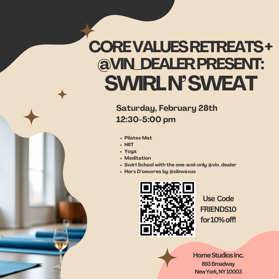 Core Values Retreats and the one-and-only @vin_dealer are hosting their 1st ever SWIRL N' SWEAT on Saturday, February 28th in Manhattan (just a few blocks from Union Square)! The afternoon will consist of Pilates mat, HIIT, yoga, & meditation, followed by Swirl School with @vin_dealer, & light bites by Wavy Savory. All levels of fitness are welcome, & a non-alcoholic wine option will be available.